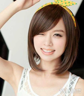 柔顺的发质,微微弯曲的发尾短发发型,清新显乖巧女生气息,简约的斜刘海修剪,搭配个可爱发带,夏日里给人足够的甜美迷人魅力。