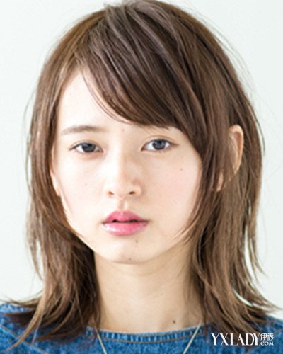 厚重的半圆形斜刘海造型设计时尚迷人,再搭配深棕色的染发颜色与碎发形式的齐肩中长发设计,修颜短脸的同是同样很显女生的温柔气质感。