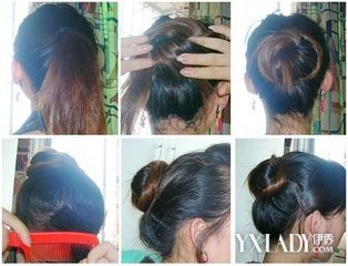 1.先将头发扎成马尾2.将头发卷紧,向左绕3.向下绕,目的是盘成一个圆4.将发尾塞进盘好的髻中5.用发簪挑起一络头发6.将发簪插进头发内的皮筋里7.成品
