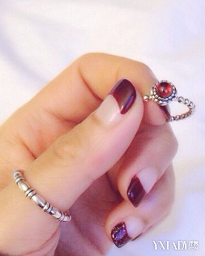 又惹眼又居有女人味的指甲爱时尚的你又怎么可以错过?来一款洒红色指甲不仅让您具有女人味,还能令您心情大悦呢。如果感觉单纯的酒红指甲会令您的指甲备感枯燥……