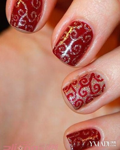 在指甲上绣上独特的图案估计是现在每位MM都喜欢的,此款酒红色带点银光色的色彩在指甲上形成具有中国特色图案的酒红色图案,很适合在婚礼上“秀”出来哦,估计届时会成为全场的焦点。