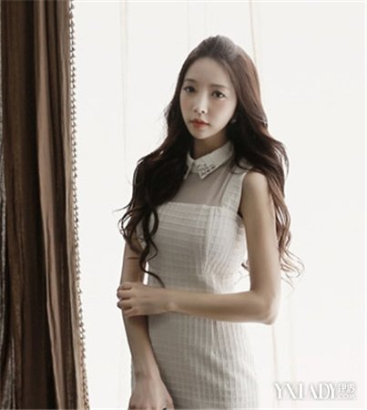 韩范十足的一款无刘海长卷发发型,这种头顶利用发夹做出的微显高耸的造型最能将脸型凸显得更加清新温柔,而随意的长卷发造型更显优雅气质感。