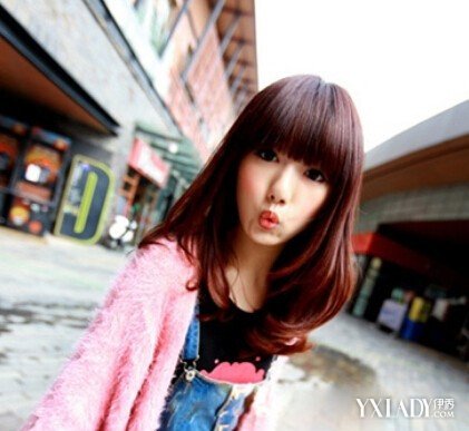 这款齐刘海内扣梨花头发型,不管是瓜子脸还是鹅蛋脸都很适合呢!红棕色的染发,十分显甜美。
