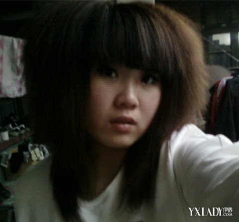 齐刘海突出眼神,锡纸烫有缩小脸型的效果,典型的非主流可爱发型。