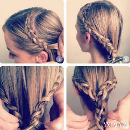 步骤五:一直编,编至耳朵处,记住一定要编得紧一点,要不然会显得很松散。步骤六:编至耳朵处的时候,就取开始夹起头发,一束一束的往下叠加。步骤七:右边的头发也是一样,一直往下编,从耳朵处开始叠加发束。步骤八:左右都编至脖颈处的时候,就把后面剩余的头发一直往下编,编成三股辫。