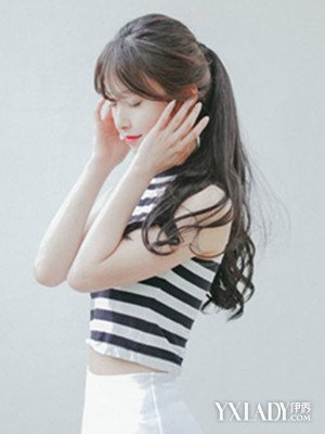 清新而空气感十足的韩式马尾辫扎法,前片留出大片轻盈空气刘海,自然黑发扎起来温文而自然,成熟而有韵味。