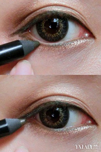 Step6:选择棕色眼线笔从眼珠上方横着延长线条,然后将整个睫毛根部的空隙填满。从上眼线的眼尾往回勾勒下眼线,只要画三分之一段就好。