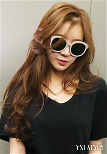 无刘海形式的长发造型与棕黄色的活力染发设计相搭,及腰式的蓬松长卷发设计更添女生十足的浪漫妩媚风,而且还显十足女神范儿。