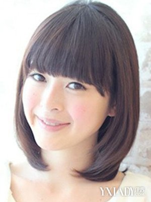 齐刘海中短发,棕灰色的染发很有气质,刚至锁骨的长度清新可爱不甜腻,发型不会太厚重,发丝修剪得比较自然,不需要太复杂的定型造型简简单单的就有不错的效果,你值得拥有。