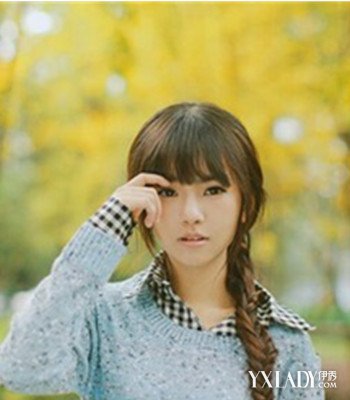 中长直发发型的扎法有很多种,这款齐刘海的女生亚麻色的简单侧绑麻花辫发型,是一款清新时尚的魅力发型。