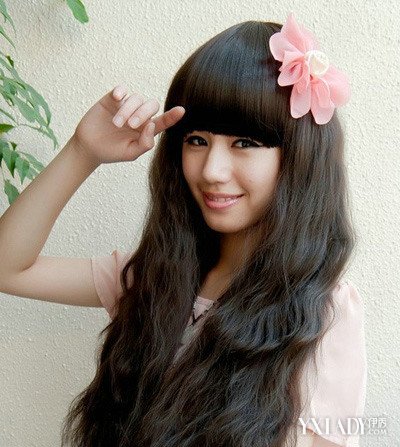 玉米烫发型2:自然的黑色长发通过玉米烫同样能有清纯妩媚的一面,整齐的刘海修剪到眼睛上方的高度,很有学院风的感觉。