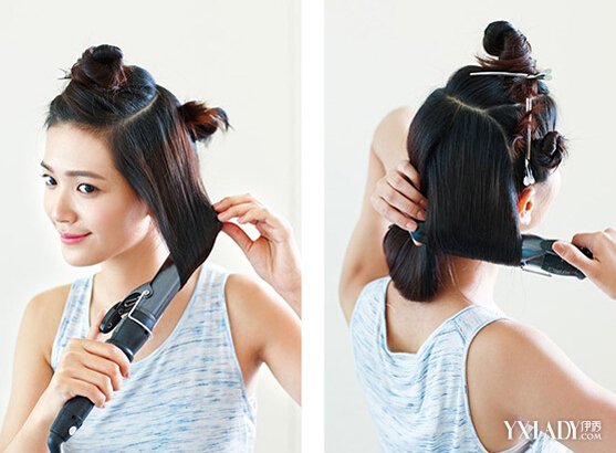STEP3:用大号的卷发棒将两侧的头发发尾向内卷。
