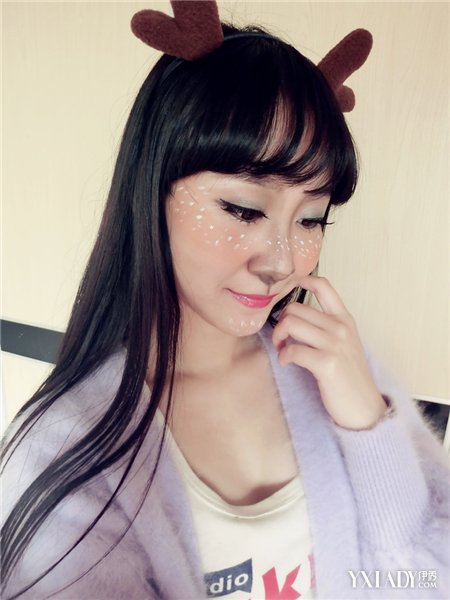这款圣诞节妆容也真算是独具匠心了,这是在cos麋鹿吗?我们都知道麋鹿是帮圣诞老人拉车的呢,所以麋鹿形象是很能表达圣诞气息的哦,萌萌哒的小麋鹿一直很受欢迎呢。这位MM不仅戴上了有鹿角的头箍,而且脸上还点着可爱的小白点,长长的睫毛忽闪忽闪的,十分动人,这样的小麋鹿你喜欢吗?