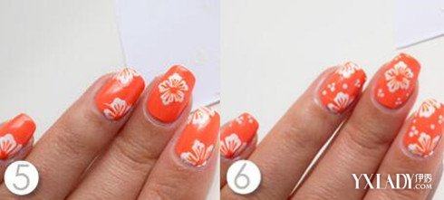 STEP5~6:接着继续用橘色的甲油,画出一丝丝的花蕊。画的时候要仔细一点,这样线才不容易连到一起去。最后再用白色甲油在花朵旁边点上一些小圆点就可以了。