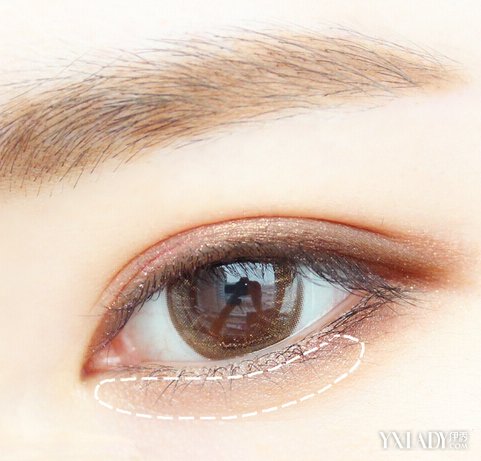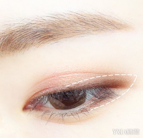 接着用闪棕色的眼影,扫在上图的白色虚线内。记得,眼影要选择带有一点点珠光效果的,但是亮片不要太大,这样的效果比哑光的要好很多哦。