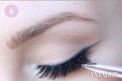 STEP4:选择适合自己喜欢的假睫毛,然后按照眼睛长度修剪好,然后在睫毛根部位置涂抹上胶水,等胶水半干的时候粘上,粘好后往里面推一下,这样会稳固很多。