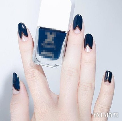 小编点评:一听到黑色美甲,很多美眉就摇头,因为黑色确实很沉闷,容易给人压抑的感觉,如何才能让黑色美甲变得不一样呢?加上一点金色指甲搭配在一起,效果立马不一样。看上面这款美甲,也是属于半透明的,指甲不要全部涂满,底部留出一个三角形,然后用金色甲油描三角形边边的位置,是不是看起来时尚很多呢?