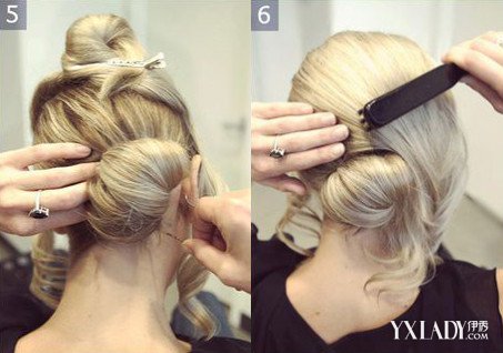 第六步:将上层的额头发放下来,然后梳到右边,拉住发尾,然后围绕着下面的盘发缠绕,用U型夹固定住,这款发型就完成了。