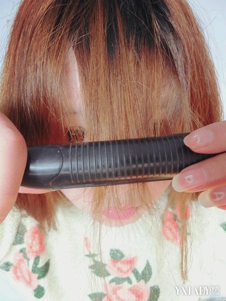 我们夹直板把前面那部分头发夹直,如果本身就是厚刘海的妹子,就可以直接把头发夹直,如果是中分的妹子请看后面我示范打薄刘海的步骤,因为我自己已经是薄刘海,所以好像没办法示范。不过后来我想了个办法,可以让大家怎么剪成薄刘海。我们先来夹直刘海吧。如下图,然后我们把头发分出来,刘海那部分留出来。
