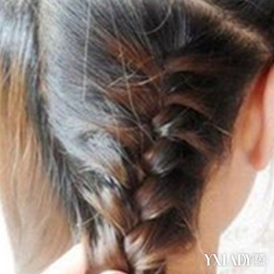 步骤七:头发编到耳际处,用黑色小皮筋将发辫的发尾固定好。