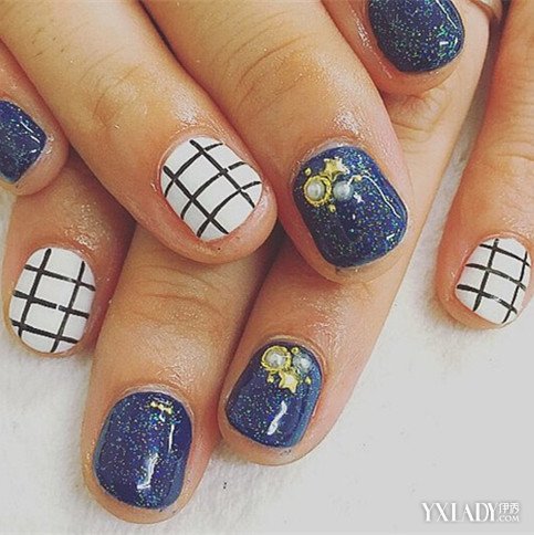 你以为珍珠美甲只能走淑女风?那你就错了!像上面这样,将黑白格子美甲与宝蓝色珍珠美甲搭配在一起,时尚感立增,个性十足,不容易跟人撞款。