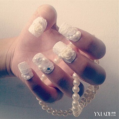 准新娘们不知道选择什么美甲,可是试下上面这款。用白色的底色打底,然后再上面加上蕾丝、珍珠、闪钻还有白色的花朵装饰,高贵优雅,不管搭配什么样的婚纱都非常好看。