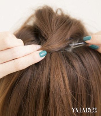 然后在第一步选取头发的右侧再取一撮头发覆盖在上面,接着用一个一字发夹将重叠的部分固定好。