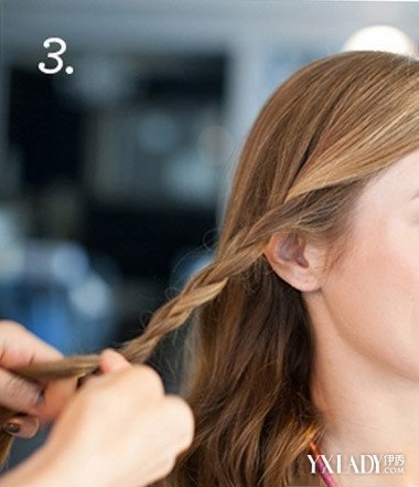 Step3:顺着刘海倾斜的方向开始编织这缕头发,可以是简单的三股辫,也可以是较复杂的鱼骨辫,这会让你稍后编织的花辫更加有质感。不用一编到底,尾部适当做保留。