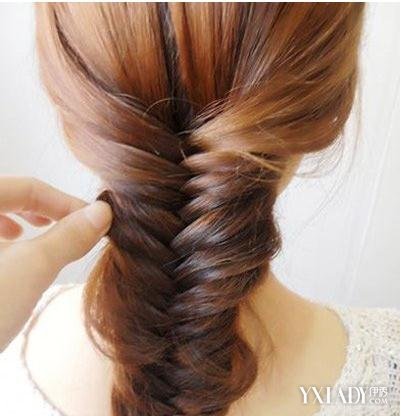 步骤三:注意往下编的时候,每叠加一束头发进来都要把发束理顺,不然编起来就会显得很毛躁。编至发尾处就可以黑色的皮筋固定起来。