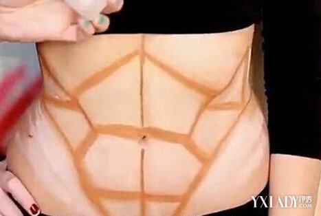 第二步:想要马甲线自然立体,那么高光是不能少的,注意了,在画的人鱼线的两侧加上高光粉,如图所示。不需要涂抹太多,一点就可以了,要不等下很难涂抹开的。