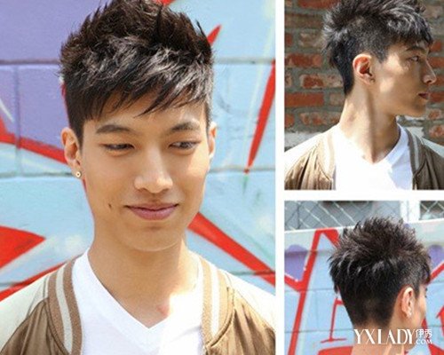 这款发型松疏的短刘海向一边倾斜,头顶的头发打蜡固定成类似鸡冠头的发型,不夸张另类,但是很有特色,后脑勺的头发剪薄剪短,清爽利落。露出浅浅的微笑,硬汉也温柔。