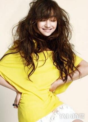 蓬乱的长卷发把脸部遮盖住大半脸颊,搭配鲜艳色彩的服装,跳跃的个性,小眼睛到变成一种特色更加的鲜明了,斜刘海又增添了一丝可爱的俏皮感。