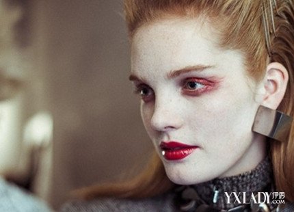 用黑色大范围的眼影框出眼眶,或用灰色的眼影带出颓废的眼神。更有甚者今季用深红色的眼影打造有点恐怖的血色妆容。