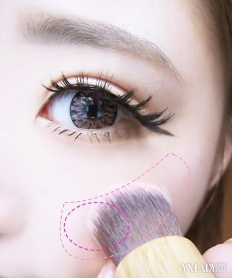 步骤5:选择浅色系珠光金色眼在眼窝前2/3的位置晕染,增强珠光的效果,不要画的范围过大,小范围抹,起到提亮的效果即可。