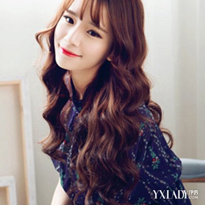 利用清新灵动感十足的空气感刘海造型来增添女生十足的甜美可爱风,再搭配这种深棕色的染发颜色与及腰形式的浪漫水波纹长卷发更添十足唯美淑女风。