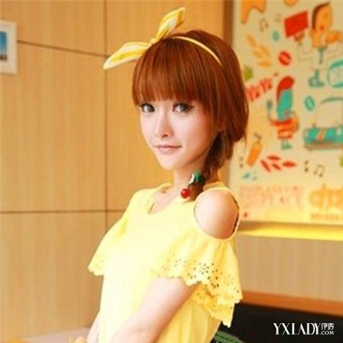 这款浪漫唯美的棕黄色柔顺发丝拢放在肩的一侧扎成编织成麻花辫,发尾折叠后用带有樱桃的皮筋固定更添调皮可爱的感觉,整齐的被修剪出完美弧度的刘海搭配上与公主裙同色系的发箍散发出清新脱俗的气质。