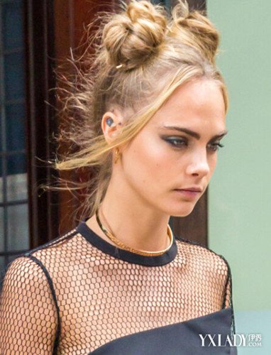 小编点评:哪吒头盘发,Cara Delevigne这款不会很死板,更容易让人接受。刘海要留一点出来,不要全部都梳上去,额头光秃秃的就不好看啦!将头发中分,头发不需要分的很刻意,可以随便一点,只要发量差不多就可以了。分好之后将头发刮蓬松一点,然后盘成丸子头的形状,用橡皮筋扎住就不容易散落。