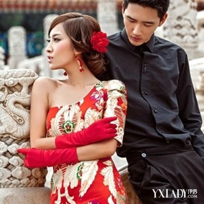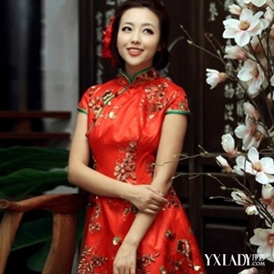 女生的盘发低低的盘在脑后,并点追上一朵大红的头饰,为整款发型增添了美感,时尚亮丽的棕黄色染发颜色,增添了浓浓的潮流气息,加上一身中国风的旗袍,尽显美丽迷人。