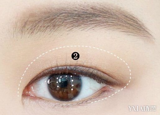 第二步:将范围缩小,在2区域的位置扫上带珠光的棕色,眼睛加上一点闪粉的效果会更加明亮,显得比较大。