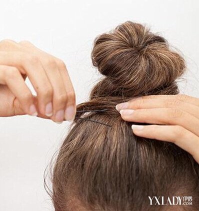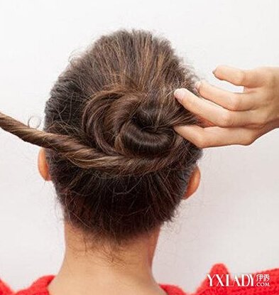 用一只手抓住发尾,然后将头发向一个方向扭转,扭转好之后,另外一只手固定住橡皮筋的位置,然后围绕着橡皮筋缠绕,头发长的要多缠绕几圈才行,如图所示。