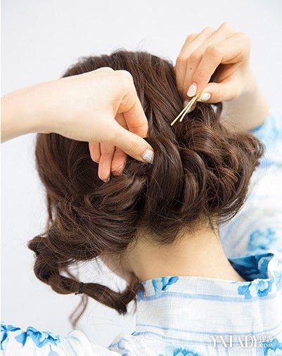 第二步,将辫子拉扯出蓬松的轮廓后用发夹固定。
