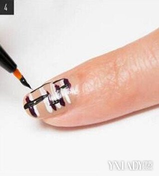 第四步:现在是最后一步了,等上面的指甲油都干透,然后继续沾黑色的指甲油,再指甲上竖着画线条,长度可随意一些,不要全都一个长度,自己如果掌握不好,就按照上图的来。