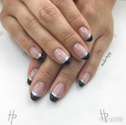 小编点评:喜欢法式美甲的,可以尝试下这款金属配色的美甲。用银色的指甲油涂抹在指尖,等干了之后,留出一小段距离,然后在指尖的位置涂抹上黑色的指甲油,最后再上一层透明亮油就可以了,很简单吧?
