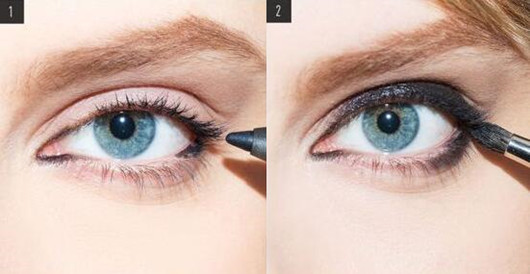 第二步:用刷子沾灰黑色的眼影,然后涂抹在上眼线的位置,眼头的位置不需要再加强了。