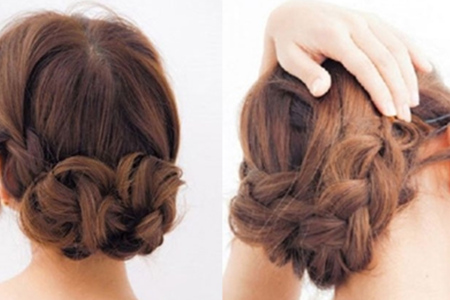 第五步:将长发辫简单盘起形成圆圆的丸子形状,这个盘发造型就完成啦。