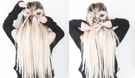 第五步:整理一下蝴蝶结,然后将两边的头发和扎发和在一起,往下开始辫鱼骨辫,如图。