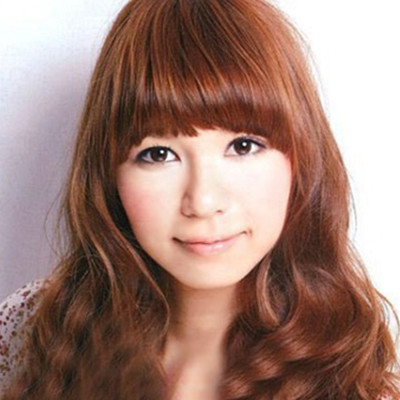齐刘海长卷发发型,适合脸型:长脸型,圆脸,鹅蛋脸。齐门帘式的厚刘海具有减龄的效果,介于眼睛以上眉毛以下的长度,使得眼睛更加有神。大波浪卷度的头发使得整体造型看起来更加柔美。