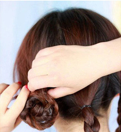 第二步:接着把三束头发编织成简单三股麻花辫,至发尾用橡皮筋扎好。第三步:把编好的辫子缠绕成低矮小盘发发,发尾用黑色小发夹固定。