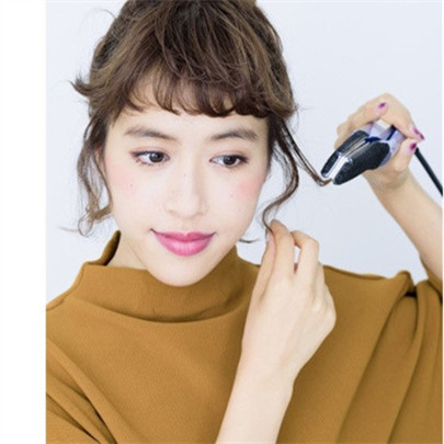 这时候后颈部位会剩下很多发丝,然后黑色小发夹与装饰发夹固定一下,可以适当留几根发丝散落。最后用卷发棒卷烫一下耳旁留下的发丝与刘海,这样就可以完成了这款丸子头扎发发型了。