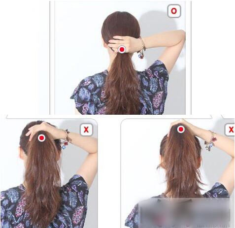 将头发稍微梳理一遍后,如图所示,把全部的头发收拢在脑后,高度控制在脖子稍上的位置即可。不要将它扎得太高哦,下面两图是错误的示范,大家要注意。